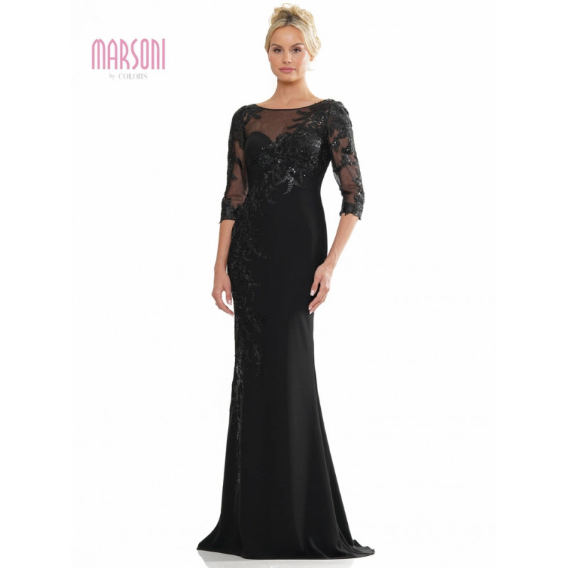 This elegant Marsoni by Colors Style M169 features a classic A-line silhouette with a gracefully embellished waist. The soft fabric and cap sleeves provide a sophisticated look.