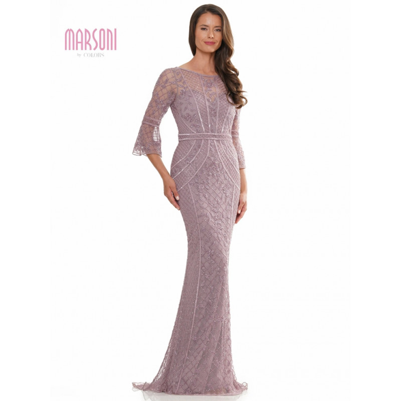A stunning evening gown featuring intricate beadwork and a flowing skirt. Perfect for elegant occasions demanding sophistication and style.