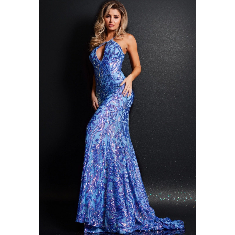 This stunning Jovani Style 23676 dress features a captivating blue sequin pattern that shimmers elegantly. Its fitted silhouette and halter neckline add a touch of sophistication.