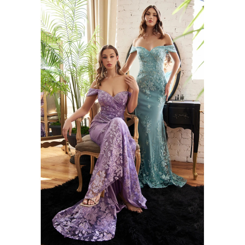 This stunning Abby Paris Style 90280 dress features a shimmering blue fabric and a daring high slit. Its fitted silhouette and embellished neckline make it a show-stopper.