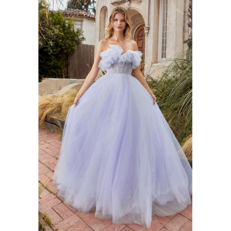 This exquisite Andrea & Leo Couture Style A1184 dress is a stunning strapless gown adorned with intricate beadwork. It features a fitted silhouette that elegantly highlights the figure.
