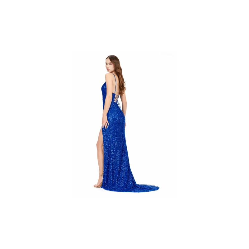 This dazzling dress by Ashley Lauren features a stunning sequin design with a plunging neckline. A thigh-high slit adds a touch of allure to this elegant piece.