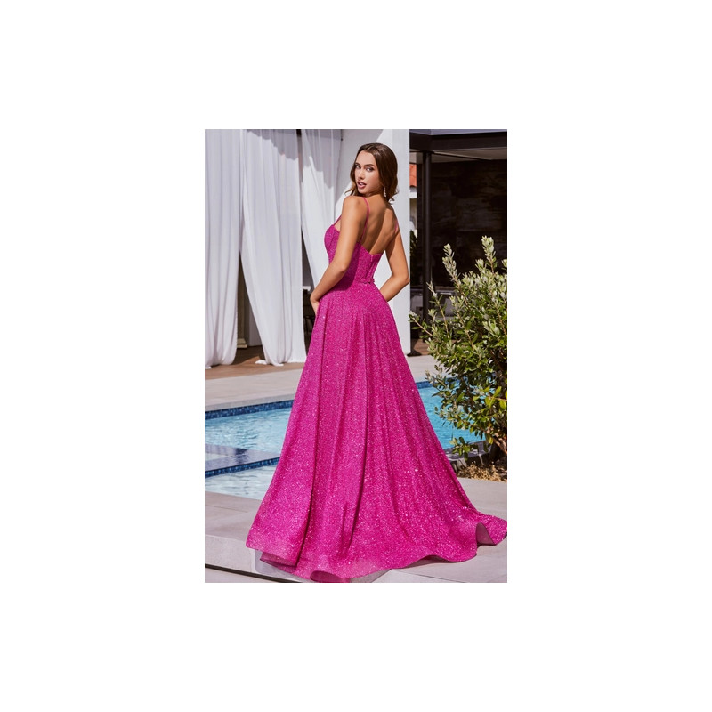 The Ladivine by Cinderella Divine Style CDS483 is a stunning evening gown designed to captivate attention. Made from a shimmering fuchsia fabric, this dress boasts a fitted bodice with a sweetheart neckline and delicate spaghetti straps that offer both support and elegance. The dress flares out into a voluminous skirt, creating a classic A-line silhouette that flatters a variety of body types. Perfect for black-tie events, proms, and weddings, this dress is both versatile and eye-catching. The glittering material catches the light beautifully, ensuring you stand out in any crowd. The expertly tailored bodice enhances the waist, while the full skirt adds a touch of drama and movement, making it ideal for twirling on the dance floor. Whether for a formal gala or a special celebration, this gown promises to make a memorable impression. With its luxurious fabric and timeless design, the Ladivine by Cinderella Divine Style CDS483 is more than just a dress; it's an experience. Its radiant color and exquisite detailing make it a perfect choice for anyone looking to make a grand entrance.