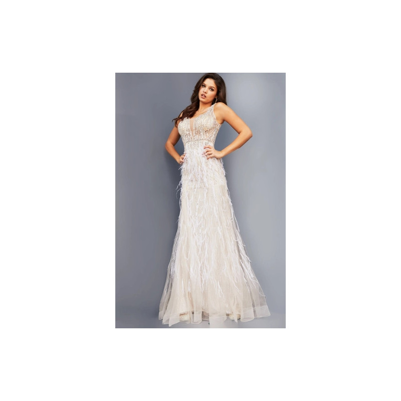 This stunning Jovani Style 08144 gown features a glamorous feathered design and intricate beadwork. The dress exudes elegance and sophistication, perfect for any formal event.